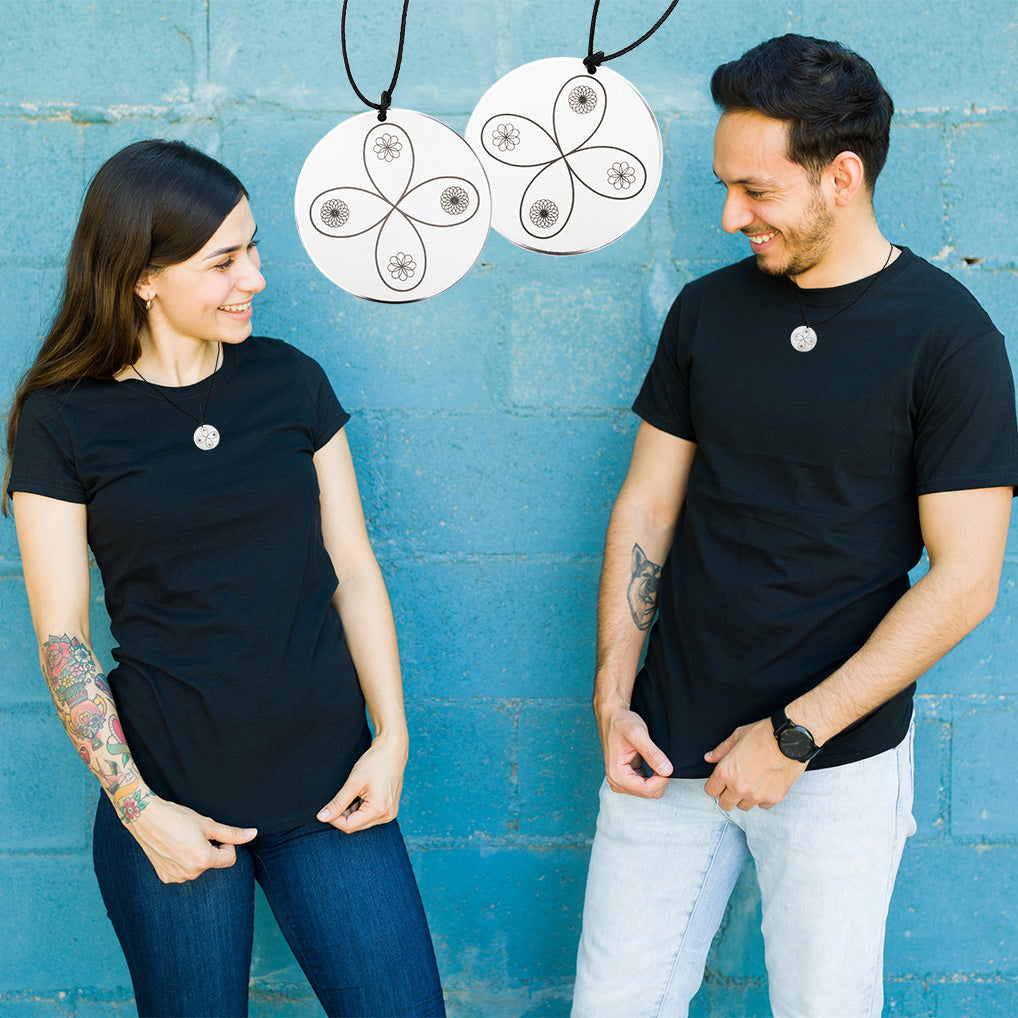The pendant is extremely durable and skin-friendly, and features the "genesis pro life" symbols laser-engraved on both sides. Both sides can be worn close to the body.