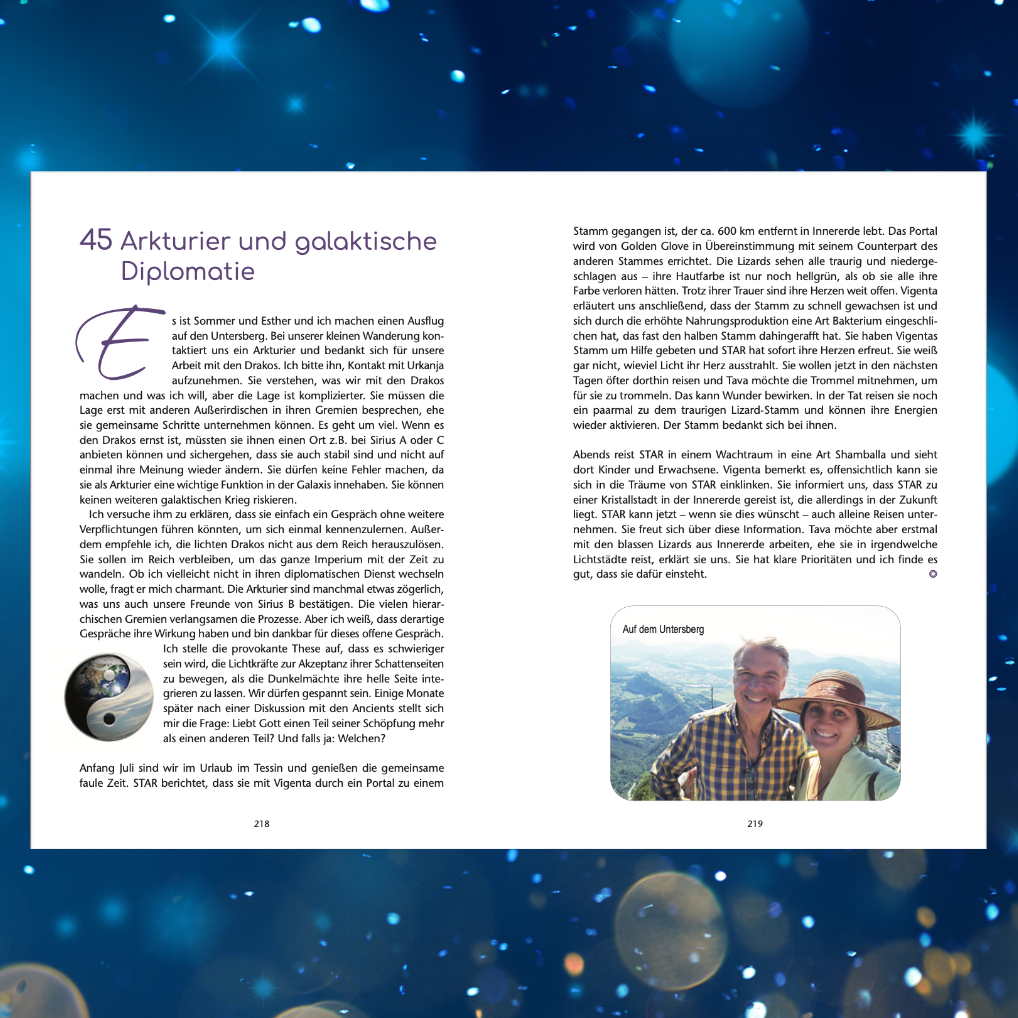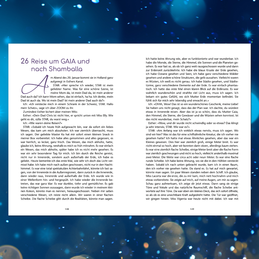 In Volume 1, "STAR – My Beloved Star Child," we experienced how the Ascended Master KUAN YIN returned to Earth to assist her in her ascension. The soul aspect chosen for this task is STAR . However, during her pregnancy in the womb of her earthly mother Esther, her energy increased so that she was not born in the 3rd dimension. We can speak with her telepathically almost daily. She spent her first months as a baby on a spaceship, where she was lovingly cared for by our extraterrestrial friends. At the beginning of 2019, we made telepathic contact with beings from the inner earth who offered to assist STAR in her descent into the 3rd dimension.